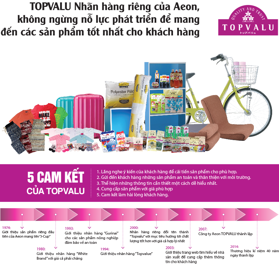 Kể từ đó, các cửa hàng của chúng tôi nhận được rất nhiều yêu cầu từ các khách hàng. Để đáp ứng yêu cầu cao của các khách hàng, nhãn hiệu riêng của AEON là “TOPVALU” chính thức được giới thiệu vào năm 1994 để thay mặt cho khách hàng khai thác các sản phẩm mà họ mong đợi. Tên của nhà sản xuất không được thể hiện trên sản phẩm TOPVALU bởi lẽ AEON đã đảm bảo trách nhiệm và giám sát tất cả các quy trình từ việc lập kế hoạch, sản xuất và bán hàng của TOPVALU. Điều này là minh chứng cho triết lý “Khách hàng là trên hết” của AEON. Chúng tôi thực hiện tiêu chuẩn quản lý chất lượng nghiêm ngặt cho quy trình phát triển nhãn hiệu riêng từ khâu lập kế hoạch cho đến khâu kiểm soát hàng hóa tồn kho nhằm đảm bảo an toàn và là sự bảo đảm cho các sản phẩm TOPVALU. TOPVALU đã trở thành một trong những nhãn hiệu riêng lớn nhất và được biết đến nhiều nhất tại Nhật Bản và doanh thu của các sản phẩm TOPVALU trong năm 2013 đã tăng lên mức 681,6 triệu Yên Nhật với hơn 6,000 mặt hàng đa dạng.
